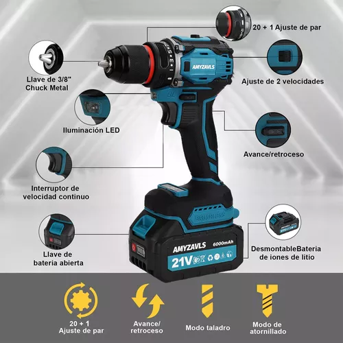 Amyzavls Kit de Atornillador de Impacto y Rotomartillo Sin Carbones 2 Baterías en Maletín de Transporte SP-3 Color Azul