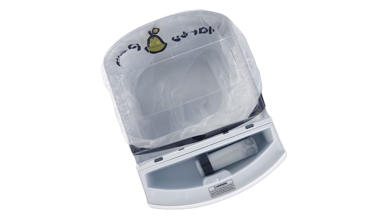 El cajón de desechos tiene capacidad para hasta 9 litros de desechos e incluye una tapa y filtros de carbón para reducir los olores.