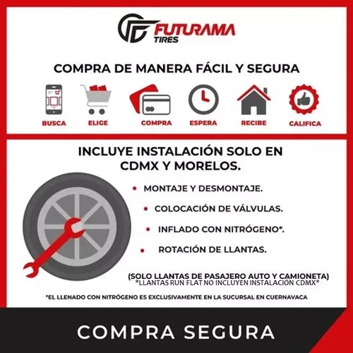 - INSTALACIÓN GRATUITA únicamente acudiendo a nuestras sucursales de Vallejo (CDMX), Cuernavaca (Morelos), Cuautla (Morelos) o Jojutla (Morelos). - Solo incluye el MONTAJE de la llanta con su VÁLVULA nueva. El balanceo y la alineación se cobran aparte - HORARIOS DE ATENCIÓN para la instalación: Lun a Vie de 9 a 18:30 h (horario de comida en CDMX de 15 a 16 h) / Sáb de 9 a 15 h. _________________________________________