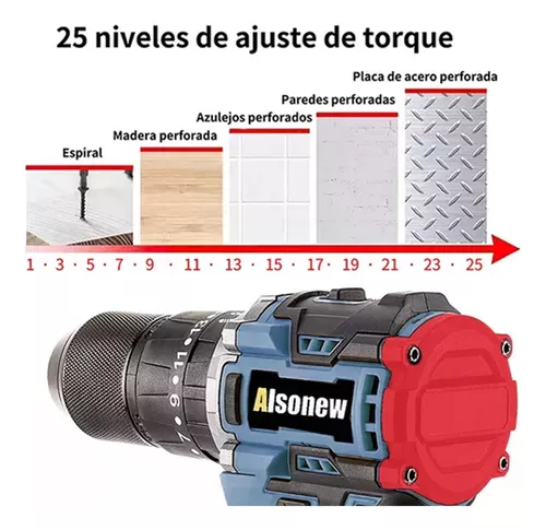 El taladro de tornillo inalámbrico tiene 2 interruptores de velocidad que le permiten ajustar la velocidad según las necesidades del trabajo. 20 + 3 torsiones ajustables proporcionan un control preciso para taladrar o atornillar en madera, metal y plástico.