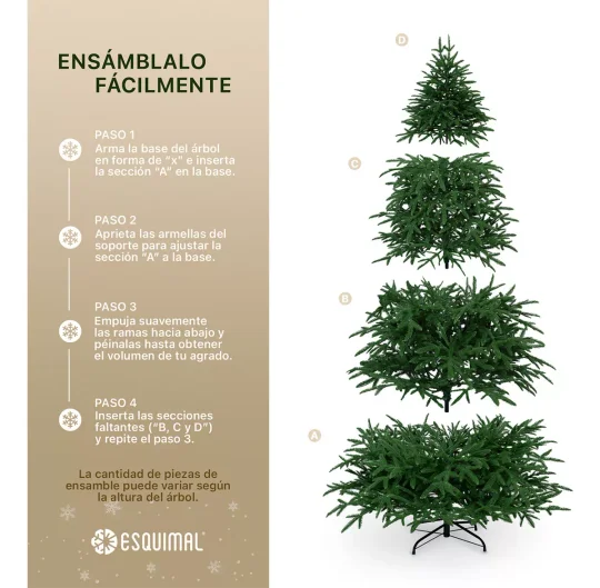 ARMAR TU ÁRBOL ES MUY SENCILLO: Comienza por desplegar en forma de “X” la base metálica (con las armellas incluidas). Ensambla las secciones de tu árbol; las ramas se desplegarán gracias a su SISTEMA DE ARMADO AUTOMÁTICO, cayendo de manera sencilla y rápida con la fuerza de la gravedad. Luego, acomoda las ramas para agregar volumen a tu árbol y, finalmente, decóralo como más te guste.