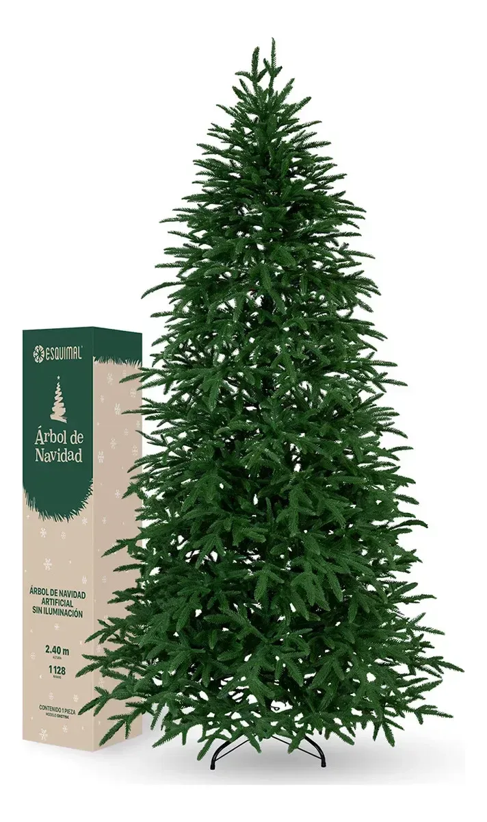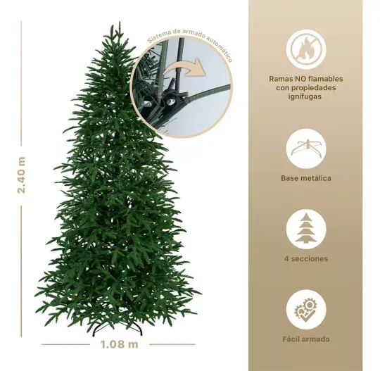 ESPECIFICACIONES: • Altura: 2.4m • Diámetro: 1.08m • 1128 ramas • Sistema armable de 4 secciones • Color: árbol verde, base metálica verde oscuro