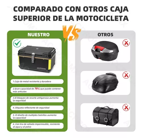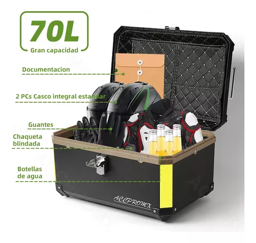 Resistencia a la intemperie durante todo el día y excelente sistema de almacenamiento, fácil de almacenar más artículos, esta caja trasera para motocicleta tiene una gran capacidad de 70L, puede almacenar 2 cascos(Como: casco motocity/casco abatible/casco motocross) también puede almacenar guantes, ropa,comida,herramientas y otros accesorios para motos que pueda necesitar en el camino, peso 6kg; capacidad de carga máxima de 250 libras, es imprescindible para cualquier motociclista que valore la comodidad y la practicidad.
