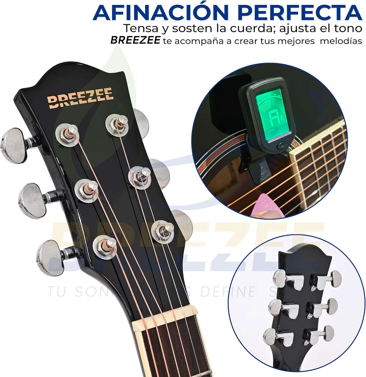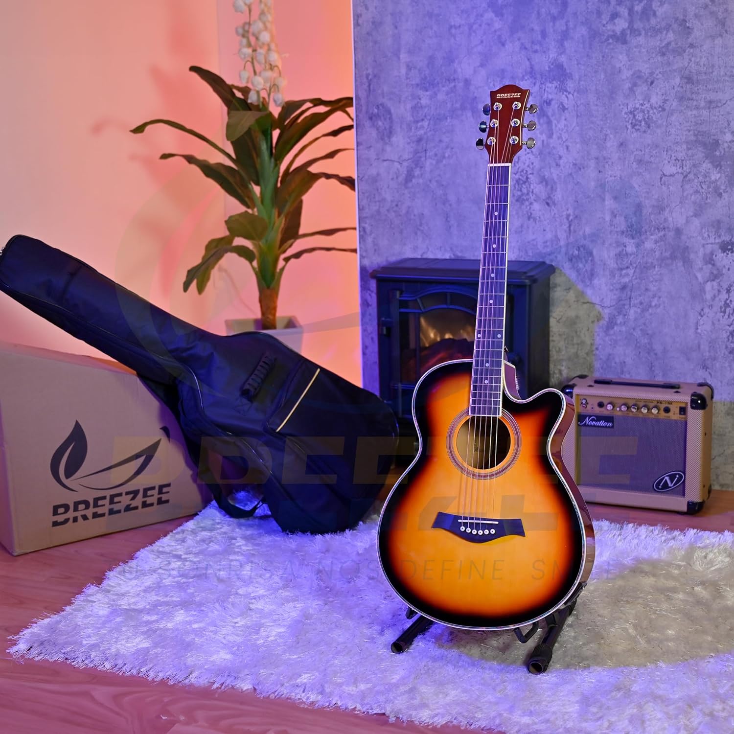 BREEZEE Guitarra Electroacústica de 40” Diseñada sobre Abeto, Merbau, Okume y Palisandro. Acabado de Barniz en Pulverización, Incluye Set de Accesorios Completo para Principiante