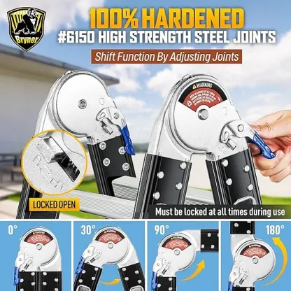 La escalera de escalón 7 en 1 Bryner cumple o supera todas las normas SGS EN131 para seguridad y estabilidad. Está hecho de aluminio de grado aviación con esquinas reforzadas diseñadas para mejorar la seguridad y la estabilidad, lo que da a esta escalera una carga máxima de peso de 550 libras.