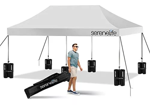 Patio, césped y jardín> Muebles y accesorios de patio> Toldos, cenadores y pérgolas> Toldos 83.55 PROTECCIÓN CONTRA DAÑO SOLAR: Esta fácil- El dosel superior cuenta con un 500D con poliéster recubierto de PU que sirve como bloqueador y UPF 50+ de la luz solar. El techo también es 100 % resistente al agua, lo que lo hace adecuado para las estaciones soleadas y lluviosas | FÁCIL DE CONFIGURAR: El dosel instantáneo de la carpa de sombra plegable con dosel deportivo puede ser ensamblado por una sola persona. Está equipado con deslizadores de empuje, extensores de patas de bloqueo de pulgar con botón de altura ajustable y velcro altamente adherido para mantener la capota adherida al marco | 200 PIES CUADRADOS: la carpa cubierta SereneLife tiene un tamaño total ensamblado de (LxWxH) 120" x 240" x 133" pulgadas y proporciona 200 pies cuadrados de sombra. Puede cubrir 4 mesas, 3 sillas de playa y 10 personas al mismo tiempo | HECHO PARA DURAR: El toldo de la tienda plegable cuenta con poliéster impermeable de 500 deniers con cubierta recubierta de PU y marco de acero resistente a la oxidación con un acabado de pintura en polvo negro para evitar la oxidación, la corrosión, el pelado o el astillado para que pueda soportar el uso repetido | TRANSPORTE CON RUEDAS BOLSA: Esta resistente carpa con toldo desplegable 10x20 - Refugio instantáneo comercial Toldo plegable/plegable Toldo emergente T Características: - Protección central estable - Velcro altamente adherido para mantener el toldo adherido al marco - Tela resistente; Cubre 4 mesas, 3 sillas de playa y 10 personas al mismo tiempo - El poliéster recubierto de plata proporciona PU duradero y UPF 50+ de Sunshine - Techo 100% impermeable y resistente a la intemperie - Adecuado para estaciones soleadas y lluviosas - Fácil de instalar, portátil y liviano para el transporte - Ruedas resistentes para un fácil transporte - Ruedas resistentes con 4 sacos de arena, 4 estacas y cuerdas para un uso estable - Tienda de campaña perfecta para deportes al aire libre, eventos, festivales y más Contenido de la caja: - (1) 10 x 10 pies Toldo emergente - (2) bolsa de transporte con ruedas - (3) bolsa de arena - (4) estacas y cuerdas Material de construcción: - 1680D bolsa de tela con ruedas (bolsa de transporte); Poliéster impermeable de 500 denier con revestimiento de PU (superior), acero resistente a las acometidas con revestimiento de polvo negro (marco) Especificaciones técnicas: - Sistema de botón pulsador: Sí - Tensión del techo: Resorte - Conectores: Nylon - Fuerza: Comercial - Peso del marco: Hasta 72 libras - Espacio libre de la cenefa: 78'' - 86'' - Capacidad: Hasta 10 personas - Dimensiones del producto (L x W x H): 120'' x 240'' x 133'' -pulgadas 304.8 cm largo - 304.8 cm ancho - 337.82 cm alto White 10x20 SereneLife SLGZ20W SereneLife