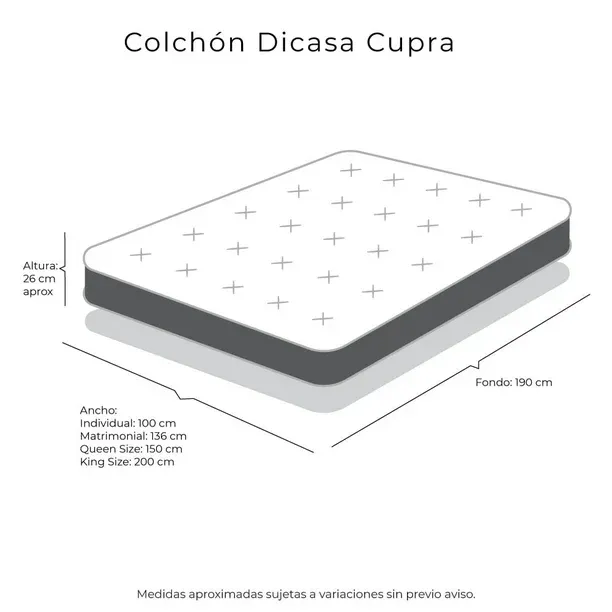 en colaboración con Restonic, desarrollaron el colchón Cupra pensado en brindar un mayor soporte a tu cuerpo y un descanso reparador con la línea Mooncare. Se compone de una colchoneta Europillow de 4 cm. Es un colchón con un nivel de confort Semi-firme y cuenta con Tecnología Worry Free que no necesita voltearse. Sistema de descanso con Soporte Moon Care y Placa de espuma de alta densidad Unidad de Resortes Continuo. Número de Resortes Individual 374 | Matrimonial 510 | Queen Size 578 | King Size 748. Medidas aproximadas: Individual 100 x 190 cm | Matrimonial 136 x 190 cm | Queen Size 150 x 190 cm 1 King Size 200 x 190 cm | 28 cm de altura.