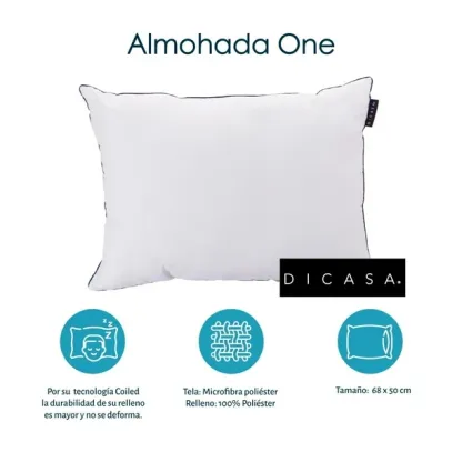 La Almohada One DICASA marca la diferencia entre un sueño plácido sin interrupciones y un mal descanso, ya que cubre los espacios vacíos entre la espalda y la cabeza, adaptándose perfectamente a la forma y peso, por su tecnología Coiled mantiene su relleno sin deformarse. Composición: Tela: Microfibra Poliéster. Relleno: 100% Poliéster. Características: Tamaño 68 cm x50 cm. Tecnología Coiled.