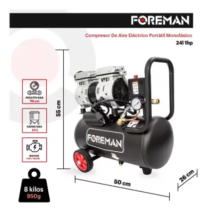 Disfruta de un rendimiento potente y silencioso con el Compresor Libre de Aceite Silencioso de 1HP de Foreman. Diseñado para brindar una operación sin aceite que reduce el mantenimiento y elimina la necesidad de cambiar o verificar los niveles de aceite, este compresor es ideal para aplicaciones donde se requiere un aire limpio y libre de contaminantes.