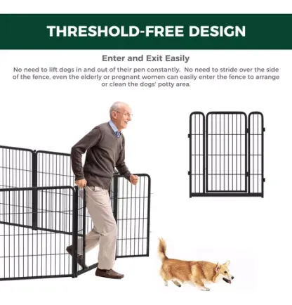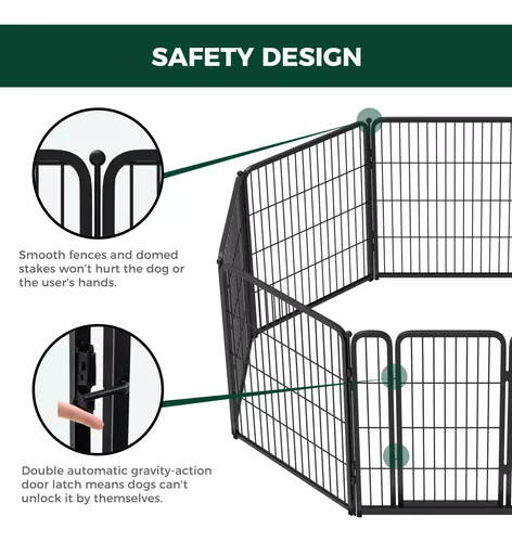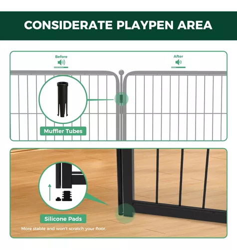 Diseñado para uso en interiores.- Como marca al aire libre, nos hemos centrado en el desarrollo de productos para exteriores. Sin embargo, cuando docenas de clientes nos dijeron que estaban buscando una configuración súper fácil de ensamblar y flexible y una cerca interior más resistente similar en estructura a nuestra cerca al aire libre, desarrollamos el corralito HomePlus después de una investigación exhaustiva. Diseño sin umbrales conveniente para que los perros entren y salgan.- los cachorros con capacidad de salto débil, perros pequeños o perros viejos con movilidad limitada pueden pasar fácilmente. El diseño automático de bloqueo por gravedad asegurará que puedas abrir y cerrar la puerta sin problemas y reducirá la posibilidad de que tu perro la desbloquee por sí mismo. Los tubos silenciadores crean un espacio silencioso y cercado.- El tubo silenciador instalado en los anillos puede minimizar cualquier ruido causado por el traqueteo de las varillas o paneles, para que puedas jugar con tu perro en un ambiente tranquilo. Al mismo tiempo, reduce la fricción de las varillas durante el uso y evita el desgaste en el revestimiento metálico. El diseño del gancho garantiza que este pequeño accesorio no se caiga, por lo que no tienes que preocuparte de que tu perro se lo coma por error. Las almohadillas de silicona mejoran la estabilidad del corralito.- las almohadillas de silicona antideslizantes instaladas en las estacas y la parte inferior del panel proporcionan fricción para reducir la posibilidad de que tus perros empujen o desmonten la valla. Estas almohadillas también evitan que las estacas rayen tus pisos. Nota.- Si desea configurar el área de juegos de una mascota al aire libre, le recomendamos nuestro corralito Rollick. La parte inferior de las estacas está diseñada con una forma cónica, lo que hace que sean más fáciles de insertar en el suelo.