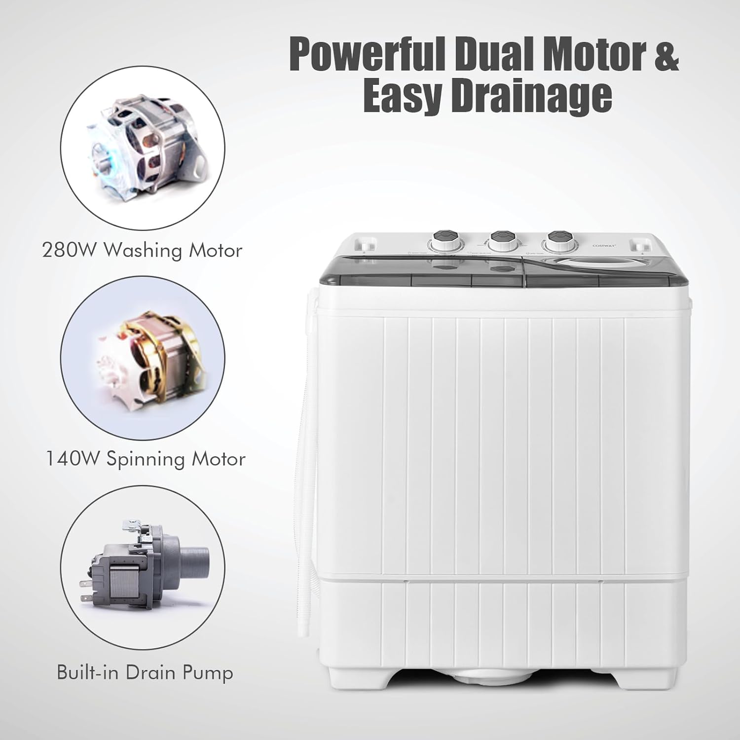 - Motor duradero: gracias al potente motor, puedes lavar tu ropa de forma rápida y eficiente. Funciona silenciosamente sin molestar a los vecinos. Potencia de lavado de 280 W y potencia de giro de 140 W garantizan una salida continua y una durabilidad prolongada.