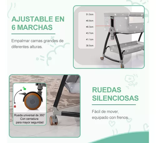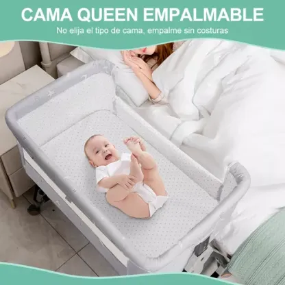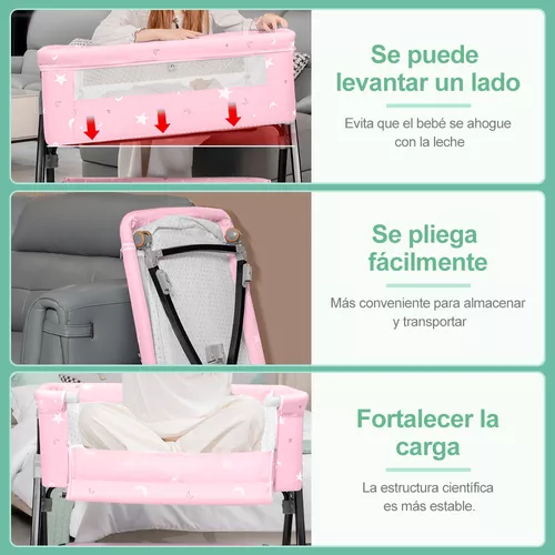 CUNA COLECHO PARA BEBE El ajuste de la altura de la cuna y de la longitud de las patas permite que la cuna colecho se adapte perfectamente a cualquier tipo de cama. Un panel lateral retráctil y las correas de sujeción incluidas facilitan la conexión de la cuna a la cama de los padres. Proporciona apoyo estable y amplio y comodidad para el sueño del bebé.