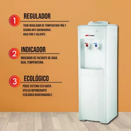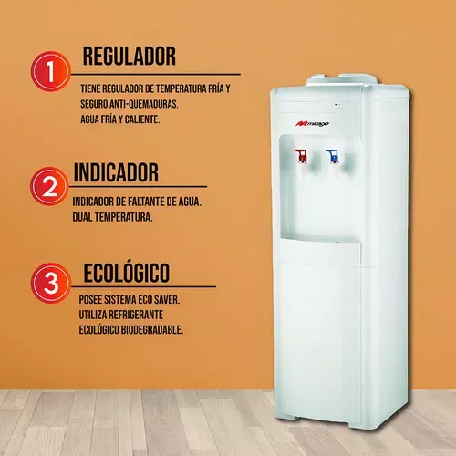 ¿Por qué elegir el dispensador de agua Mirage? • Temperatura Dual: su sistema de operación permite proporcionar agua fría y caliente. • Gabinete de almacenaje extra: Excelente indicador para reemplazar el garrafón de agua. • Permite almacenar y mantener el agua a una temperatura ideal. • Este dispensador está confeccionado con materiales resistentes y duraderos, que te garantizarán una bebida segura en todo momento.