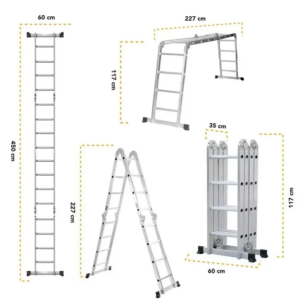 • Medidas en escalera recta (LAxANxAL): 60x10x450 cm. Plegada (LAxANXAL): 60x35x117 cm. Peso de la escalera (neto): 16kg.