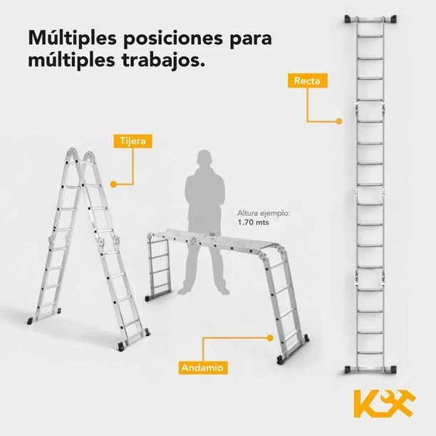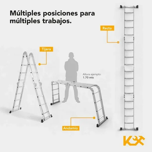 • Incluye: 1 Escalera multiposiciones de aluminio, 2 plataformas.