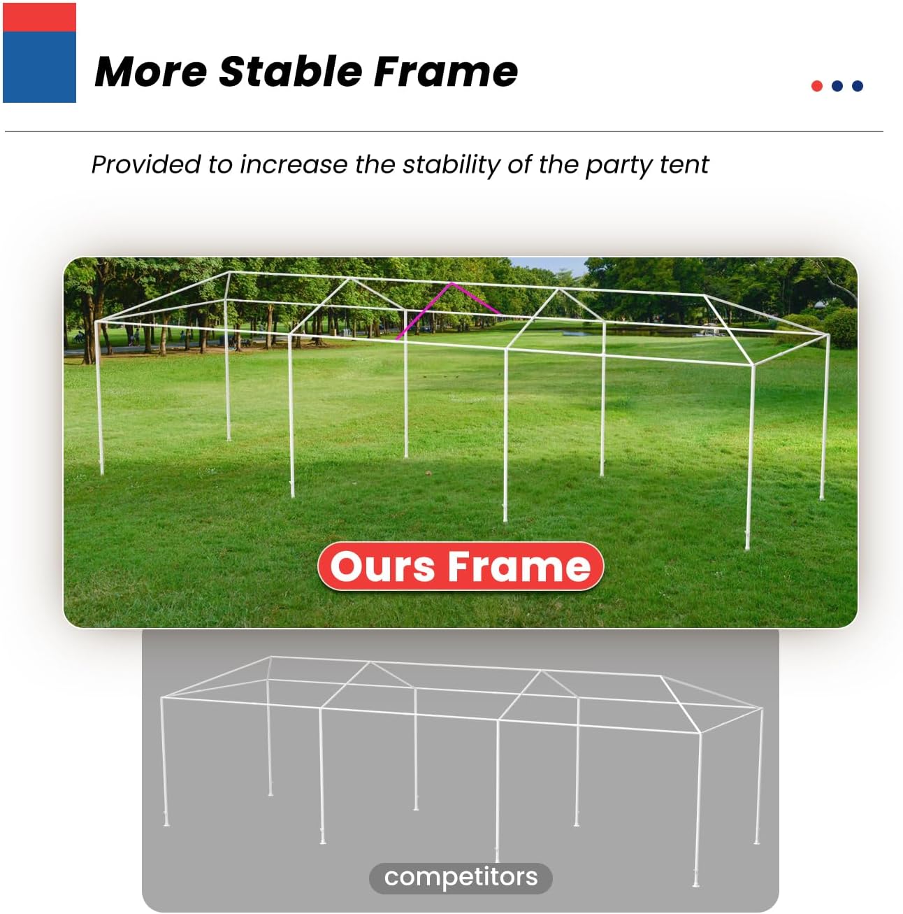 Alta calidad: la conexión de plástico entre los tubos mejora la estabilidad del marco de la tienda. La tienda de campaña de fiesta tiene un marco de acero con recubrimiento de polvo blanco resistente al óxido y a la corrosión, tubo de acero de 0.6/0.7 mm, conector de plástico de material nuevo de la tienda de campaña de boda hace que el marco sea más fuerte que otros, proporcionamos cuerdas y estacas para mayor estabilidad. Tienda de campaña para bodas y fiestas.