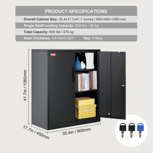 Carga fuerte y almacenamiento ordenado: ¡Tome el control de su almacenamiento con el gabinete de almacenamiento metálico VEVOR! Con una capacidad de peso de 200 libras por estante, este gabinete puede soportar 600 libras en total, proporcionando un amplio espacio para almacenar y organizar sus pertenencias. Di adiós al desorden y da la bienvenida a un espacio limpio y organizado con nuestros robustos armarios de almacenamiento.