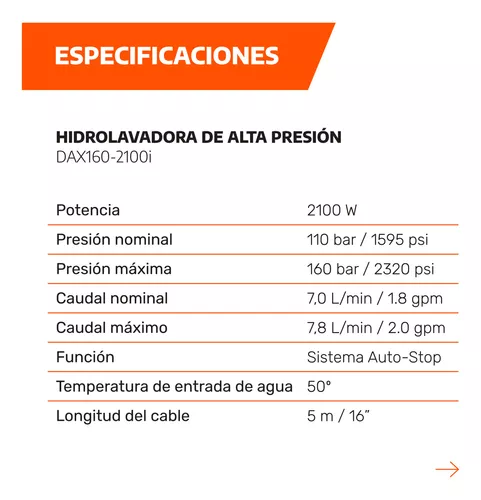 - Presión máxima: Alcanza una presión máxima de 160 bar (2320 psi), lo que garantiza una limpieza profunda y efectiva.