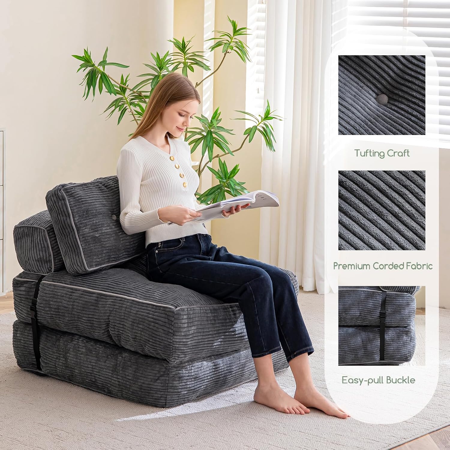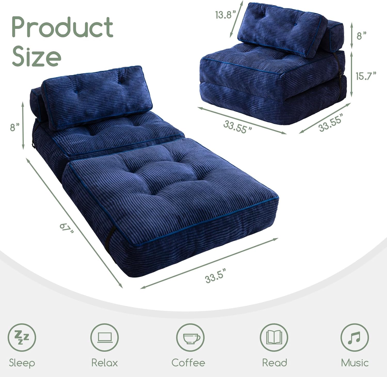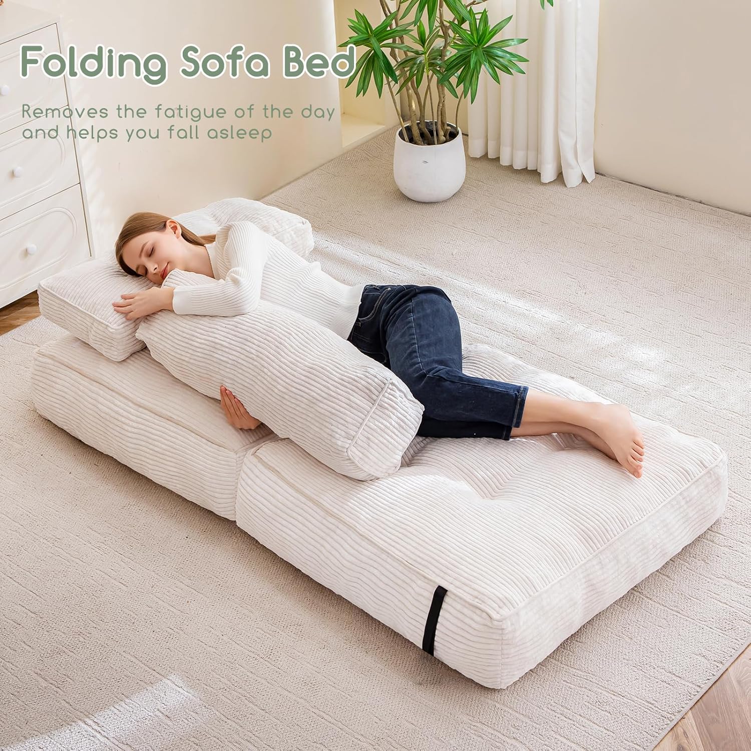 - Funcionalidad versátil: el sofá cama plegable transita sin esfuerzo entre un cómodo sofá y una práctica cama, por lo que es perfecto para espacios pequeños, habitaciones de invitados u oficinas en casa. Su diseño plegable maximiza el espacio, ofreciendo una solución práctica para leer, ver televisión, jugar o tomar una siesta reparadora.