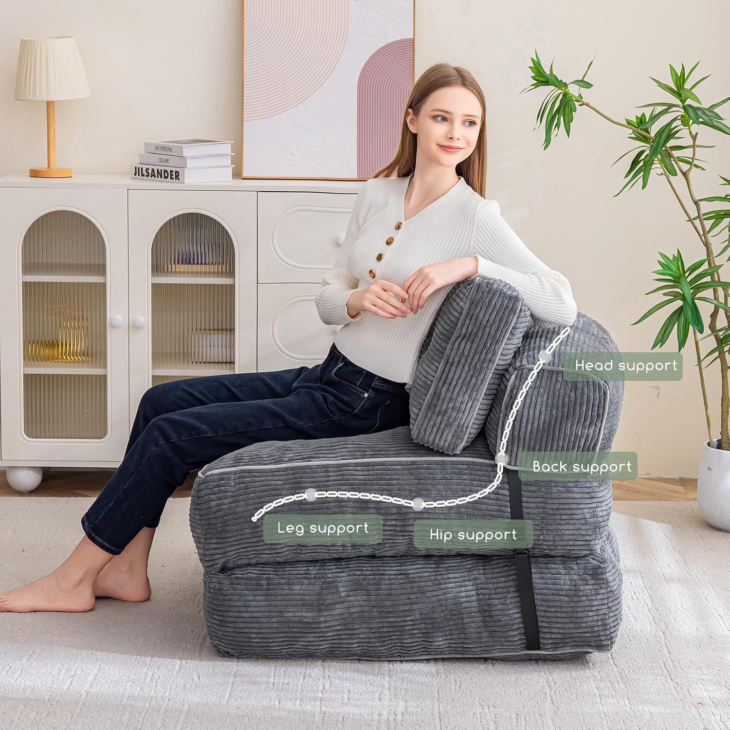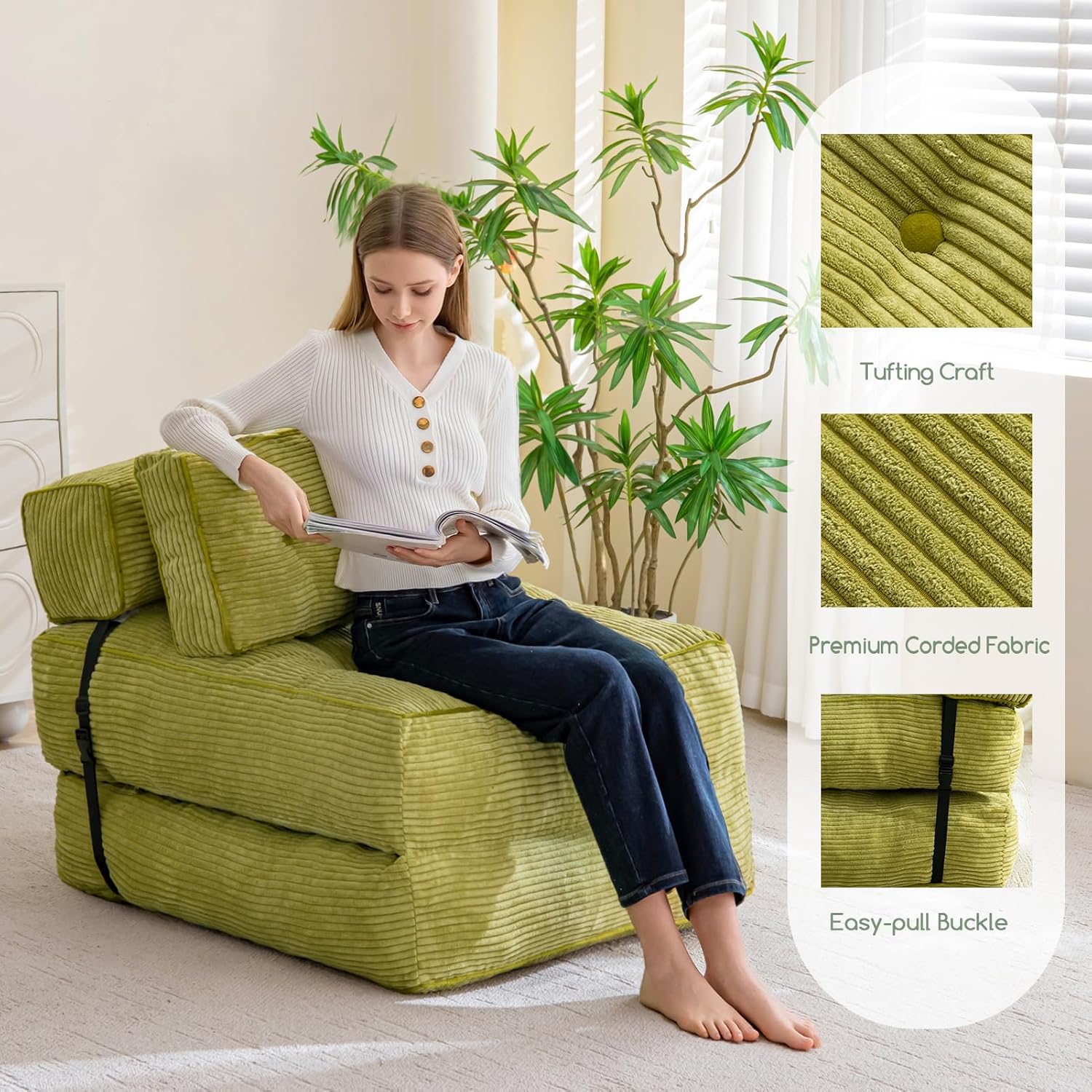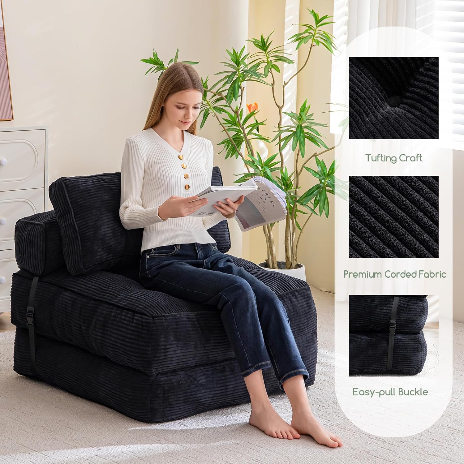 - Funcionalidad versátil: el sofá cama plegable transita sin esfuerzo entre un cómodo sofá y una práctica cama, por lo que es perfecto para espacios pequeños, habitaciones de invitados u oficinas en casa. Su diseño plegable maximiza el espacio, ofreciendo una solución práctica para leer, ver televisión, jugar o tomar una siesta reparadora.
