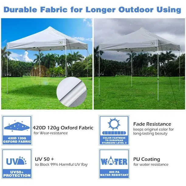 - Universal Replacement Cover - InstaHibit 9.6x9.6ft Replacement Pop up Canopy Top, fits for tent's size from 9.5x9.5ft to 9.6x9.6ft, with 2.6ft long central pole of the frame, a brand-new top to replace your old canopy or as a backup; Perfect for shading in outdoor places such as backyard and patio, also for exhibition sites, flea markets - UV50+ Protection & Fade Resistance - Effectively blocks 99% UV ray to protect you from harmful sunlight, helps reduce the temperature under the top; Color fastness up to European Standard level 3 keeps original color under sun exposure for long-lasting beauty - Durable Fabric - Made of 420D 120g Oxford fabric with silver PU coating, the canopy features water and wear resistance for extended lifespan, perfect for outdoor usage - Easy Installation with Customizable Area - Tool-free Installation; Self-adhesive straps for easy fixing the top to the frame; D-rings on corner for easily fixing with ropes; Loop fasteners inside the hemline for adding sidewalls; Also, loop fasteners on the valance for freely attaching and changing your logo, banner to show the theme of the activity - Measurement Tips - Helps you determine whether the tent frame fits our canopy top: 1st, measure the length and width of your tent frame; 2nd, measure the central pole of the frame; Please make sure any of your measurements should not exceed the compatible frame size range, otherwise it will not fit your frame