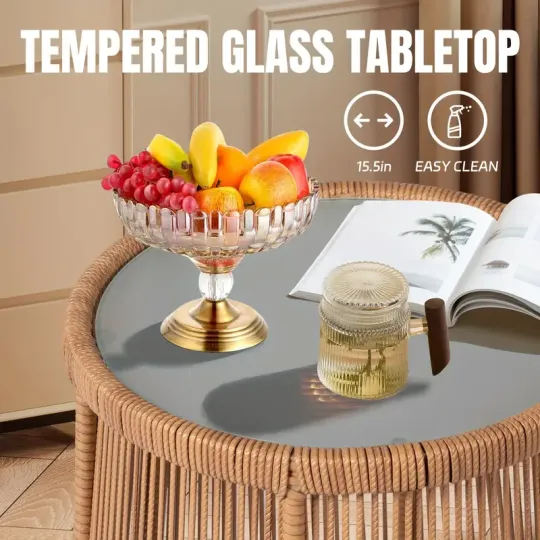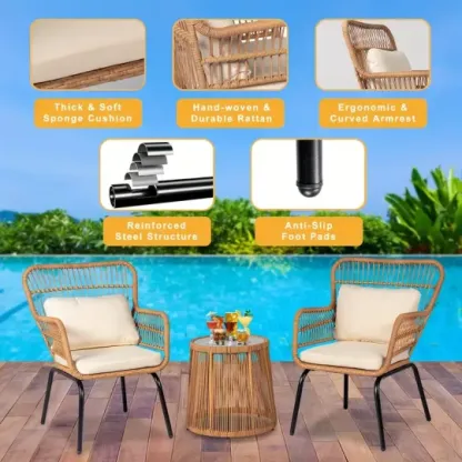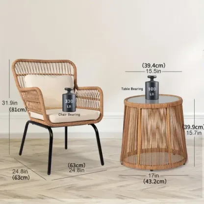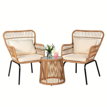 Juego de 3 muebles de mimbre para patio, incluye 2 sillas y una mesa con tapa de vidrio, ideal para porche, exterior, patio trasero, apartamento, balcón, color natural.