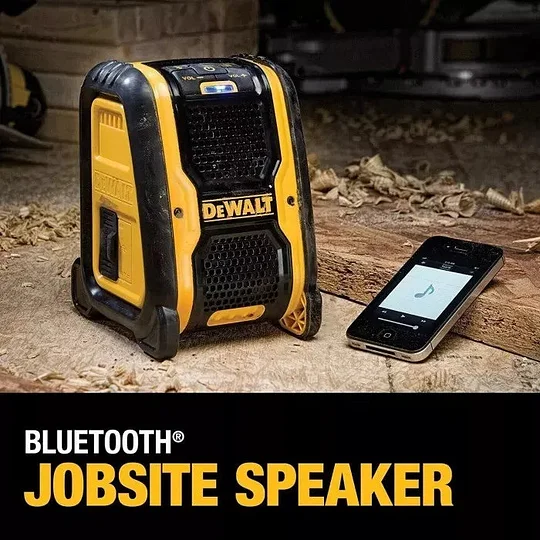 El altavoz Bluetooth para el lugar de trabajo DCR006 funciona con CA/CC y funciona con paquetes de baterías DEWALT de 12 V y 20 V MAX*.