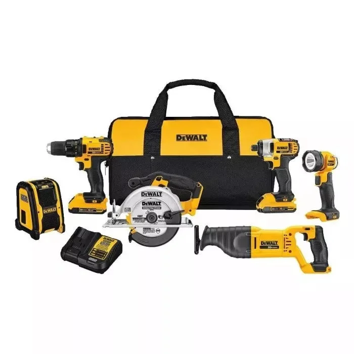 1) Taladro atornillador DCD780 20v MAX* 1/2", 1) Sierra alternativa DCS381 20v MAX*, 1) Atornillador de impacto DCF885 20v MAX* 1/4", 1) Luz de trabajo LED DCL040 20v MAX*, 1) DCS393 20v MAX * Sierra circular, 1) Altavoz Bluetooth DCR006, 2) Paquetes de baterías de iones de litio de 2,0 Ah de 20v MAX*, 1) Cargador, 1) Bolsa de contratista.