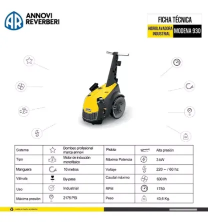 HIDROLAVADORA INDUSTRIAL AR ITALIANA ELECTRICA .MODELO MODENA 930 . 220 V · 2175 PSI · 3 KW .MOTOR DE INDUCCION · 10 METROS DE MANGUERA · PISTOLA DE ALTA PRESIÓN . PESO 43.6 KG . CAUDAL 630 L/H