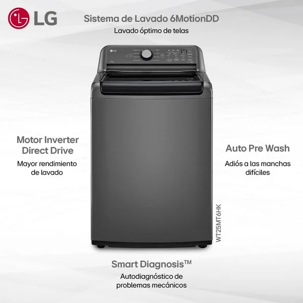 Lavadora LG Carga Superior Inverter DD con sistema de lavado 6 Motion DD, capacidad 25 Kg - Color Negro - WT25MT6HK; cuenta con sistema de lavado 6 Motion DD, una vez que hayasseleccionado el ciclo de tu preferencia, la tecnología 6 MotionDD combinaráhasta 6 diferentes movimientos para ofrecerte un excelente desempeño delavado sin maltratar tu ropa. Tiene 8 programas de lavado. Cuenta conJetSpray para un mejor enjuague de la ropa. Adicional, tiene función deAutodiagnóstico LG Smart Diagnosis por medio del celular, que es una manerapráctica y fácil de diagnosticar y solucionar algún problema del equipo. La tecnología de su MotorInverter Direct Drive tiene alto rendimiento de lavado, ahorra energía ycuenta con 10 años de garantía.