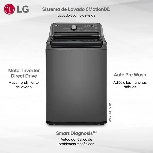 Lavadora LG Carga Superior Inverter DD con sistema de lavado 6 Motion DD, capacidad 25 Kg - Color Negro - WT25MT6HK; cuenta con sistema de lavado 6 Motion DD, una vez que hayasseleccionado el ciclo de tu preferencia, la tecnología 6 MotionDD combinaráhasta 6 diferentes movimientos para ofrecerte un excelente desempeño delavado sin maltratar tu ropa. Tiene 8 programas de lavado. Cuenta conJetSpray para un mejor enjuague de la ropa. Adicional, tiene función deAutodiagnóstico LG Smart Diagnosis por medio del celular, que es una manerapráctica y fácil de diagnosticar y solucionar algún problema del equipo.