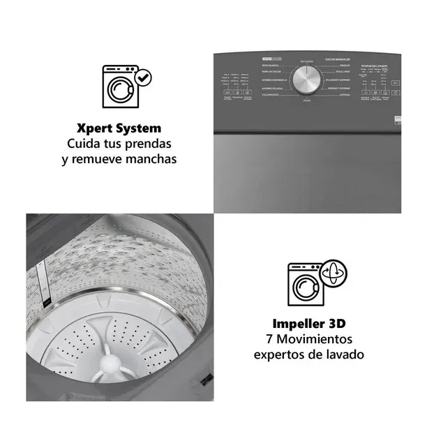 Cuenta con Impeller 3D, 8 ciclos automáticos: Ropa Blanca Xpert Cycle, Ropa de Color Xpert Cycle, Intenso con Remojo Xpert Cycle, Ahorro de Agua Xpert Cycle, Delicados, Express, Jeans, Voluminosos, y 4 ciclos manuales: Remojo, Solo Lavar, Enjuagar y Exprimir, Drenar y Exprimir.