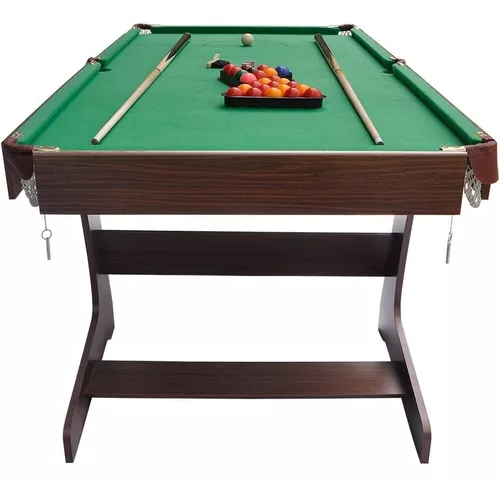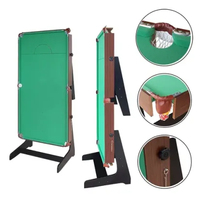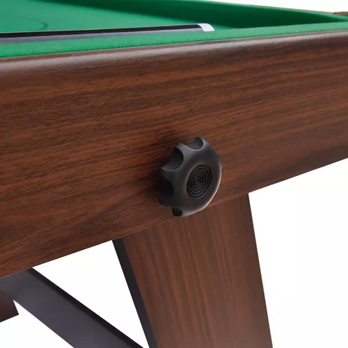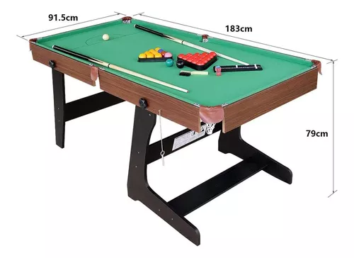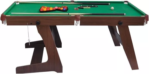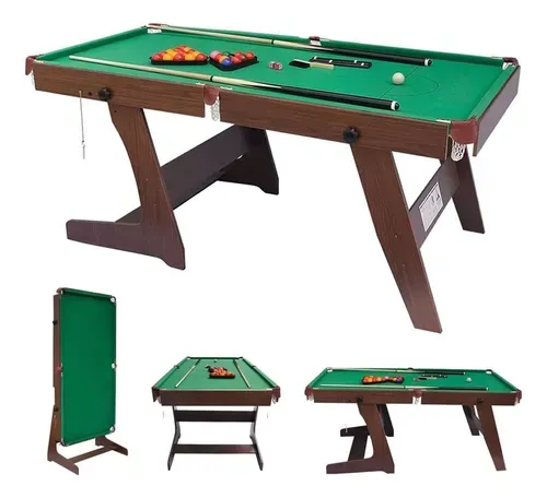 Diseño Plegable y Compacto: Optimiza el espacio en tu hogar con esta mesa de billar que se pliega fácilmente, perfecta para áreas reducidas y de fácil almacenamiento. Materiales de Alta Calidad: Fabricada en MDF con acabado en PVC y fieltro suave, garantiza una superficie de juego duradera y de alta calidad para una experiencia de juego superior. Dimensiones Ideales: Con medidas de 152 cm x 76 cm x 79 cm, se adapta perfectamente a cualquier espacio de entretenimiento en tu hogar. Juego Completo de Accesorios: Incluye todo lo necesario para disfrutar de una partida completa: 2 tacos de billar de 48", juego de bolas de billar, 2 triángulos, 1 marcador, 1 llave de cabeza hueca y 1 cepillo de mesa. Fácil Montaje y Desmontaje: Diseñada para un montaje rápido y sencillo, ideal para reuniones familiares y eventos con amigos. Elegancia y Funcionalidad: Combina un diseño elegante con máxima funcionalidad, convirtiéndose en el centro de atención y diversión en cualquier espacio. Incluye: