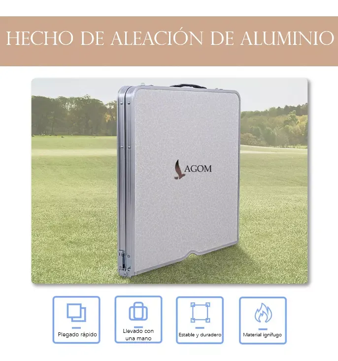 La mesa está fabricada en aluminio inoxidable resistente, con una superficie de melamina MDF impermeable y resistente a los rayos UV. La superficie completamente lisa proporciona un espacio seguro para colocar objetos y alimentos, mientras que el marco de aluminio con bordes redondeados garantiza comodidad y seguridad contra golpes.