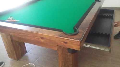 Mesa de billar en madera con cajon Mide 260 por 140 Es mesa de 8 pies Incluye 2tacos juego de bolas triángulo 10 tizas Madera de pino En color nogal Paño verde rojo azul negro Checa 3l destino primero por que los paquetes se mandan por separado por 2 paquterias