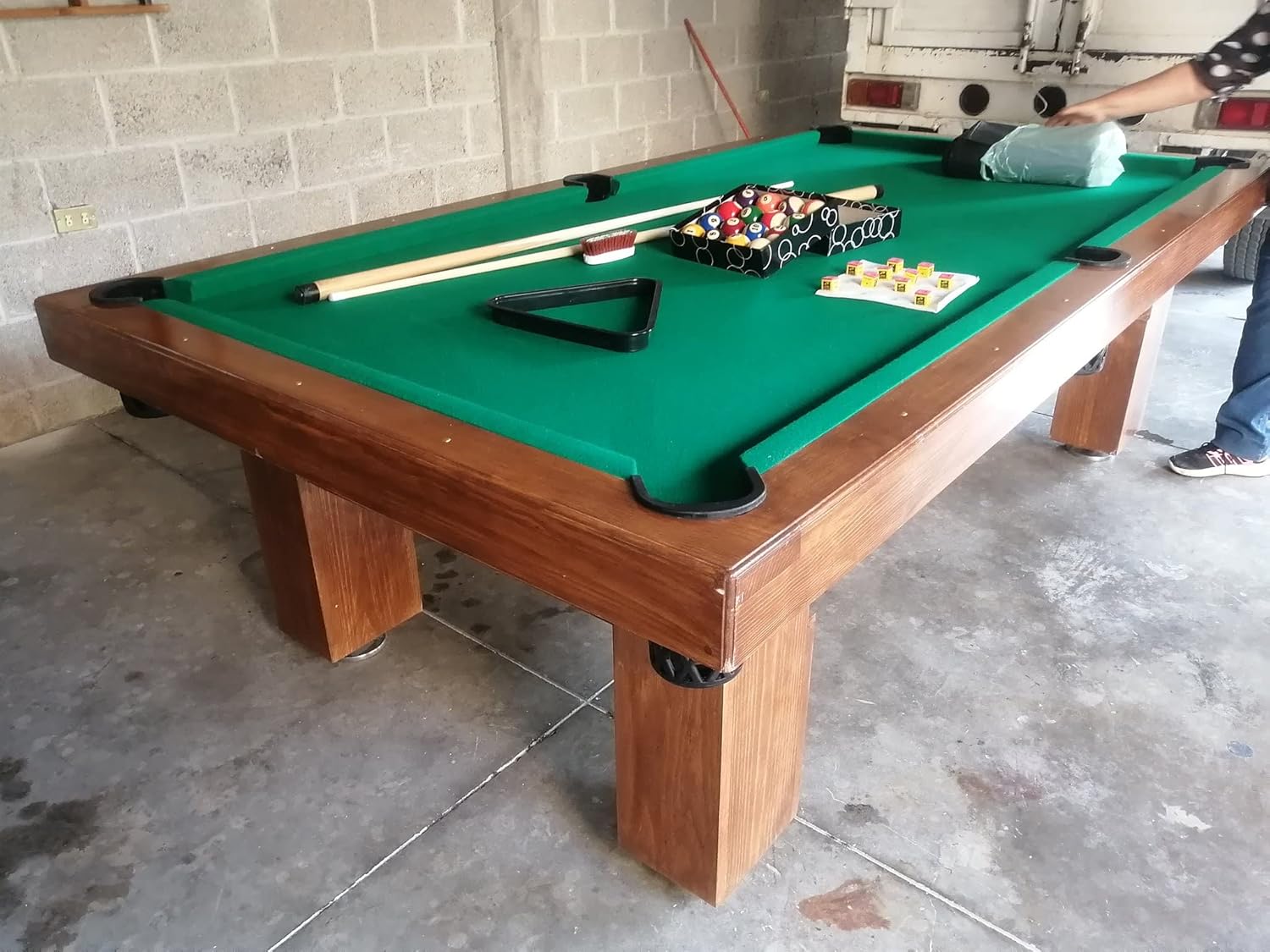 - Equipo completo: 2 tacos de billar, 10 piezas de tiza de billar, 1 juego de bolas de billar, 1 cepillo de mesa y 1 triángulo.