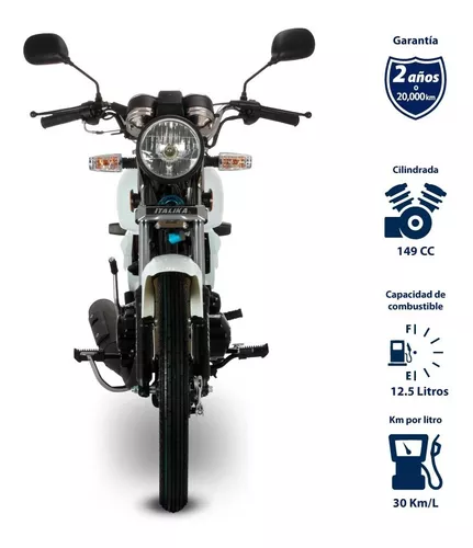 MOTOR Tipo de motor 4 Tiempos, monocilíndrico Cilindrada 149 CC Velocidad máxima 90 km/h Potencia máxima 11.2 Hp @ 8500 RPM Sistema de arranque Eléctrico y de pedal Capacidad de combustible 12.5 L Rendimiento de combustible por tanque 400 km