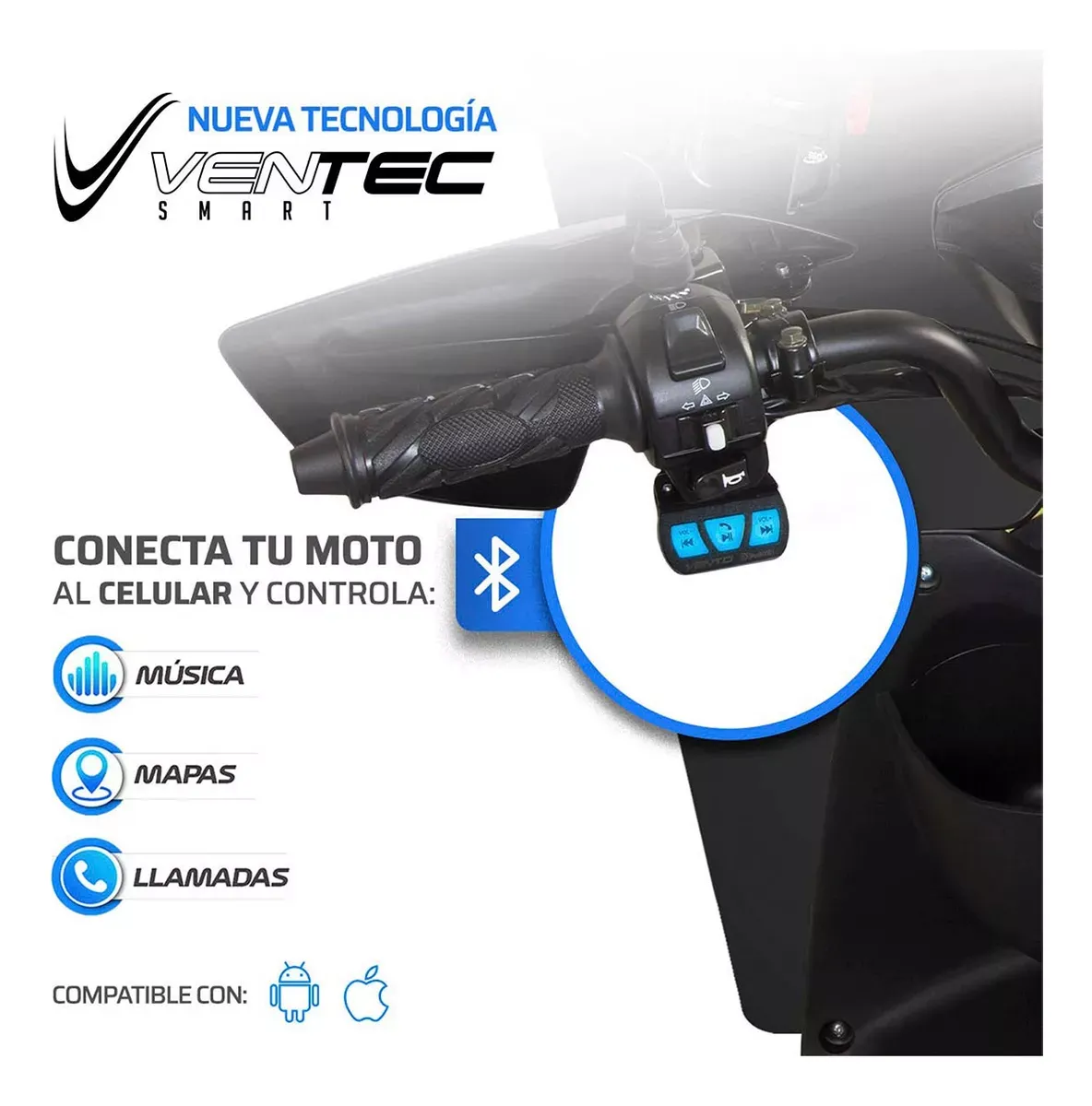 Además, la incorporación de la tecnología VENTEC, te permitirá enlazar la moto con tu smartphone para subir o bajar el volumen de tus canciones favoritas, adelantar o regresar canciones y contestar o declinar llamadas.
