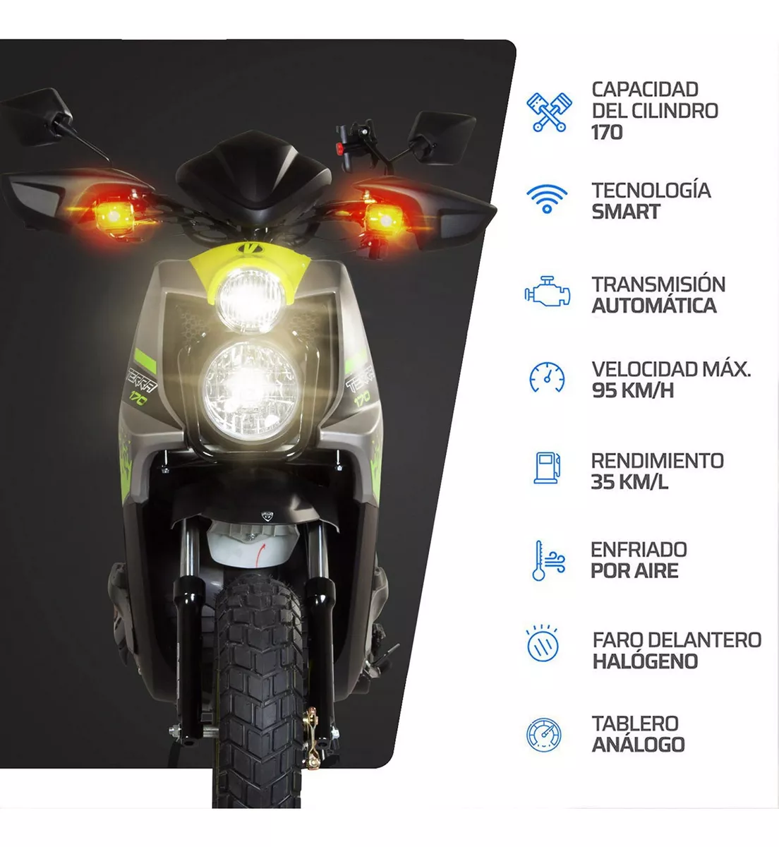 Cuenta con parrilla de carga, cajuela bajo el asiento, rines de acero prensado, cumbre puños y un asiento amplio para hacer de tú experiencia algo inolvidable.