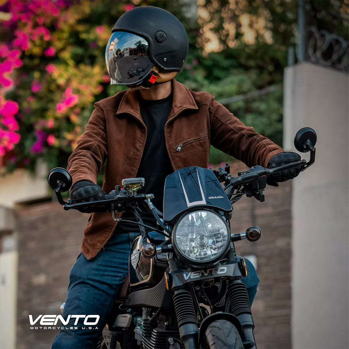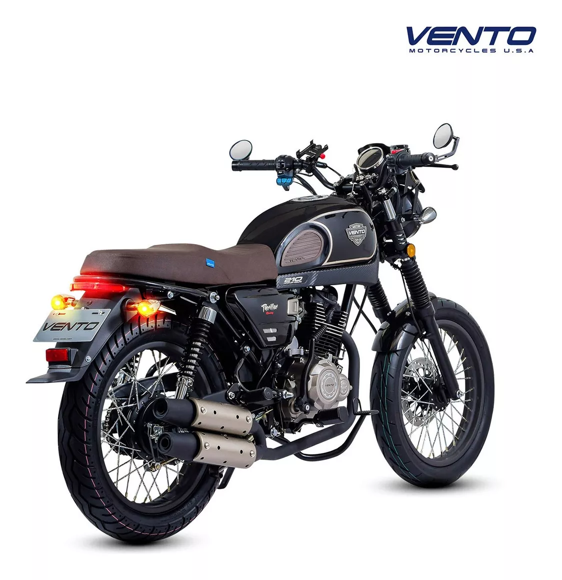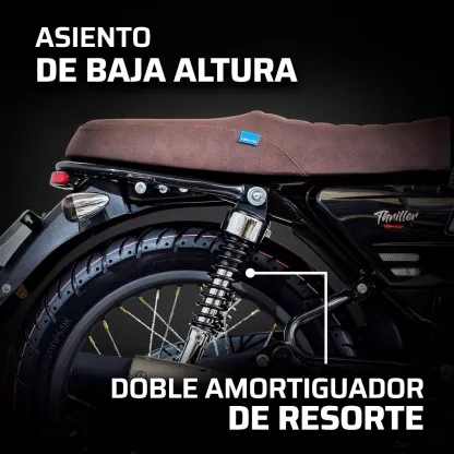 Para viajar con seguridad, el freno delantero es de disco hidráulico, mientras que el trasero es de tambor, mientras que su suspensión trasera es de doble amortiguador con resorte. ¡Todo lo que deseas está en esta Vento Thriller negra!