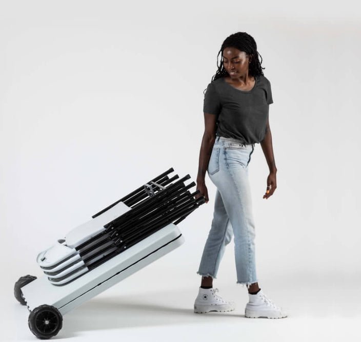 Despliega la mesa, expande las patas y simplemente retrae las ruedas hacia arriba y fuera del camino hasta que sea el momento de plegarlo todo y listo. Cuando sea el momento de ir, simplemente despliega las ruedas, carga los estantes con tu equipo y ¡deslízate!