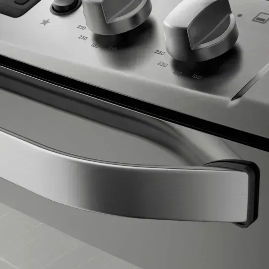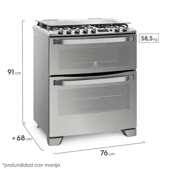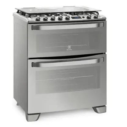 Moderna y segura, la Cocina Doble Horno Electrolux (76DXR) cuenta con dos hornos independientes a gas y un grill eléctrico para que puedas gratinar y dorar preparaciones y darle un toque especial a tus alimentos en el tiempo justo, gracias a su temporizador digital y reloj que facilita el control del tiempo de cocción. Sus dos hornos con temperatura independiente, permiten cocinar diferentes planos al mismo tiempo, sin mezclar aromas ni sabores. Cuenta también con cinco hornallas, una de ellas con función triple llama, que proporciona mayor rapidez en la cocción. Además, sus hornallas están selladas, de manera que no permiten la entrada de residuos al interior de la cocina. También el Recubrimiento FastClean evita la acumulación de grasa y facilita la limpieza del horno.