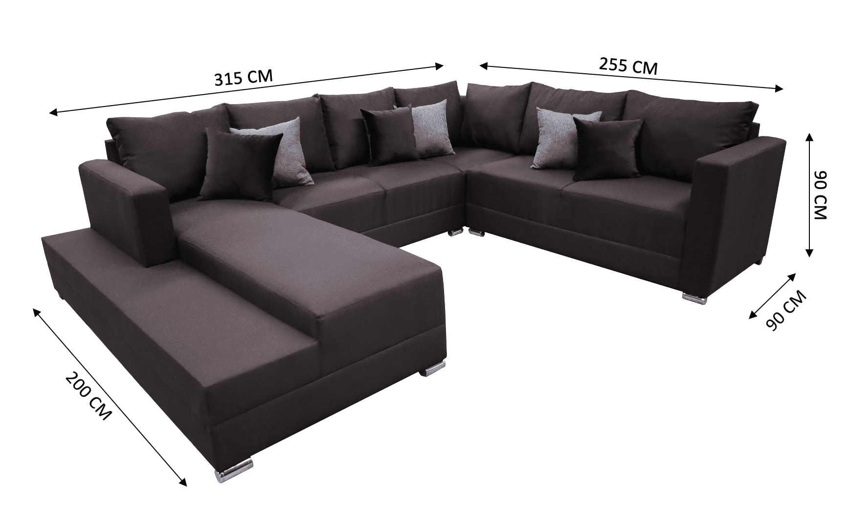 Medidas: Largo derecho 255 cm, largo frente 315 cm, largo izquierdo 200 cm, Profundidad 90 cm, Alto 85 cm