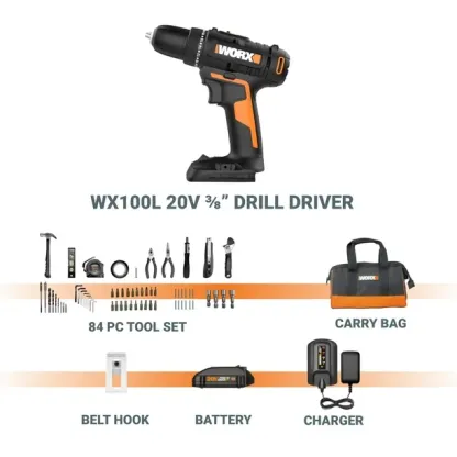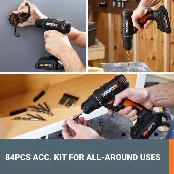 Taladro inalámbrico WORX de 20 V, 3/8 pulgadas, con kit de accesorios de 84 piezas