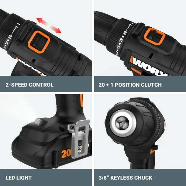 • Worx Taladro inalámbrico de 20 V 3/8 pulgadas con kit de accesorios de 84 piezas, juego de taladro variable de 2 velocidades de 265 pulgadas en libras, par de torsión 20+1 embrague, destornillador - Taladro diario es fácil: con engranajes totalmente metálicos, este taladro inalámbrico logra un par máximo de 265 in-lbs. para pasar por tareas comunes, como montaje de muebles, colgar imágenes, taladrar/conducir paneles de yeso, reparaciones del hogar y proyectos de bricolaje - INCLUYE: Taladro inalámbrico de 20 V 3/8 pulgadas, (1) kit de accesorios de 84 piezas, (1) clip para cinturón, (1) bolsa de transporte, (1) batería de 2.0 Ah, (1) cargador - Misma batería, potencia expandible: la misma batería Power Share que funciona con este taladro se puede utilizar cómodamente con más de 140 herramientas eléctricas, equipos de energía al aire libre y productos de estilo de vida de la plataforma WORX Power Share - Incluye kit de accesorios de 84 piezas: cuenta con las puntas más útiles para el uso diario, así como herramientas manuales esenciales para completar tu experiencia inalámbrica de taladro eléctrico, como un martillo, cinta métrica, destornillador, llave ajustable, cuchillo utilitario y más - Compacto y ligero: con solo 6.8 pulgadas de largo, el diseño inalámbrico del taladro eléctrico está optimizado para facilitar la perforación/conducción en espacios reducidos. Y pesa solo 2.54 libras. (con batería), puedes abordar proyectos largos y trabajos generales sin desgastarte - Control de velocidad sin costuras: ajusta rápidamente los ajustes variables de 2 velocidades [0-400 RPM/0-1600 rpm] para utilizar el taladro inalámbrico en una amplia gama de aplicaciones. Invierte fácilmente la dirección para una rápida extracción del sujetador - Adaptar el par de torsión: ¿Busca taladros eléctricos con un control de par óptimo? Este taladro/destornillador proporciona 20+1 ajustes de embrague para cubrir diversas aplicaciones, como evitar el exceso de marcha o pelar tornillos - LUZ LED PARA LA VISIBILIDAD: Perforar en espacios oscuros nunca es un desafío gracias a la brillante luz LED del taladro que ilumina las superficies de trabajo y mantiene la precisión - Mayor comodidad: el taladro/destornillador alimentado por batería cuenta con un agarre de goma para mejorar el manejo y mantener tus manos cómodas - REEMPLAZO RÁPIDO DE BIT: Intercambia las brocas en un instante con el portabrocas sin llave de 3/8". El taladro inalámbrico acepta todas las brocas estándar