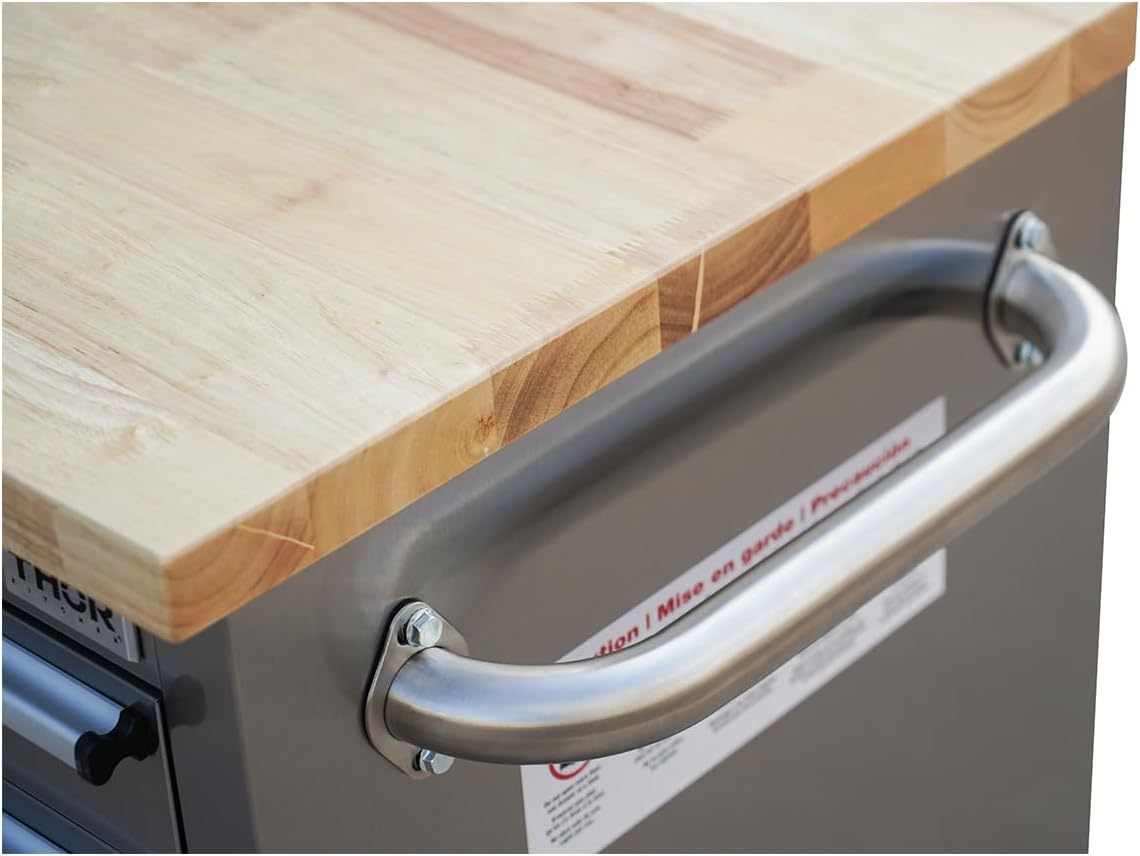 Modelo HTC4804W1-2 .Mesa de trabajo / Isla de cocina Thor Kitchen de 1.20 mts y 4 cajones en acero inoxidable de alta calidad con acabado antihuellas ideales para guardar sus platos, cubiertos, y utensilios de cocina. Con una encimera de madera atractiva y duradera, este gabinete puede funcionar como una isla de cocina, brindando más espacio para la preparación y el almacenamiento de alimentos para su cocina al aire libre, fiestas y reuniones al exterior. Movilidad conveniente. Equipado con ruedas bloqueables y manijas tubulares, el gabinete con ruedas de acero es fácil de mover a donde lo necesite. Los rodamientos de bolas de los cajones cuentan con una capacidad de 20-25 kg cada uno que proporcionan un buen soporte para el almacenamiento. El mantenimiento del gabinete es fácil, simplemente use agua tibia y un paño de microfibra para la limpieza de rutina.