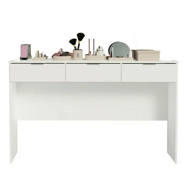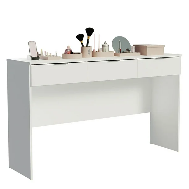 Recordando el modelo camerino, este tocador está compuesto por tres cajones espaciosos con tiradores de aluminio. Las bisagras y los rieles son metálicos, y los herrajes de alta calidad aumentan la vida útil del mueble. Cuenta con un refuerzo en la parte frontal para una mejor estabilidad.