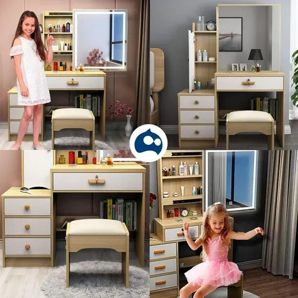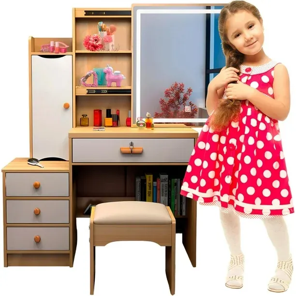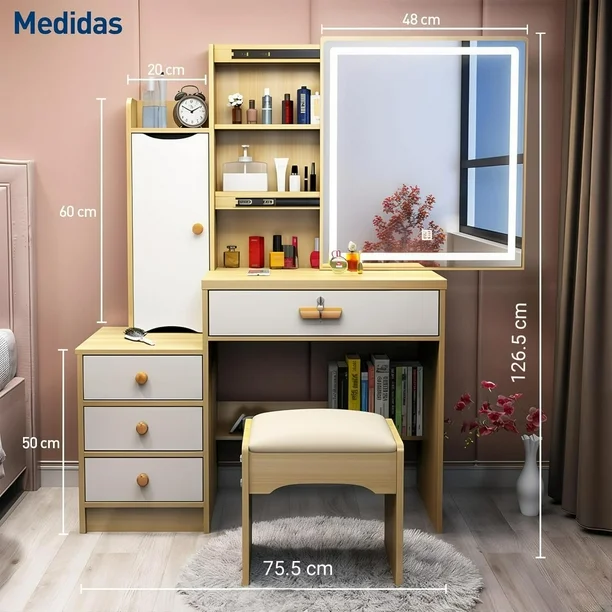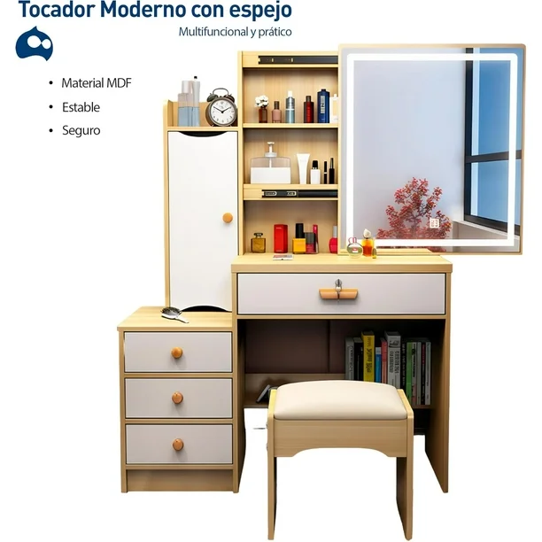 El tocador con espejo y luces LED es ideal para espacios reducidos, junto con un espejo LED deslizante. Con tres modos de iluminación, ajustables en brillo, combina durabilidad con estilo gracias a su construcción de MDF y metal. Su diseño elegante y funcional proporciona claridad superior para una rutina diaria más glamorosa, siendo fácil de montar con instrucciones claras.