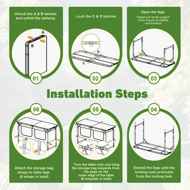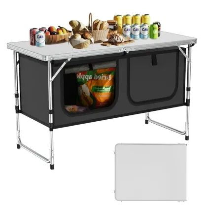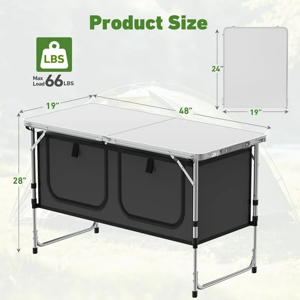 MEJORA TU EXPERIENCIA AL AIRE LIBRE: Nuestra duradera mesa de camping compuesta de aluminio es impermeable, resistente al desgaste, resistente al calor y a la corrosión, lo que proporciona una mejora para todas tus aventuras al aire libre. ÚLTIMAMENTE PORTÁTIL: Con su diseño liviano y tamaño compacto, nuestra mesa plegable para acampar se puede instalar en minutos y llevarse a cualquier lugar, lo que garantiza una experiencia cómoda y conveniente mientras acampa, camina o hace un picnic. MAXIMIZA TU ESPACIO: Mantente organizado con el espacioso organizador que cuenta con 2 casilleros con cremallera de gran capacidad hechos de material Oxford 600D duradero. La bolsa de almacenamiento desmontable permite un fácil transporte, lo que garantiza que sus alimentos, bebidas y cubiertos estén siempre a mano. ESTABLE Y FUERTE: La estructura triangular, hecha de tubos de aluminio engrosados y pestillos reforzados en ambos lados de la mesa, le permite soportar hasta 66 libras, proporcionando una superficie resistente y confiable para que disfrute de sus aventuras al aire libre. SOLUCIÓN VERSÁTIL: Con su capacidad de funcionar como parrilla y estación de preparación de alimentos, mesa para servir e incluso como soporte para TV, nuestra mesa plegable para acampar con almacenamiento se adapta a una variedad de entornos en casa, desde autocaravanas hasta picnics, fiestas en interiores y exteriores e incluso educación en casa.