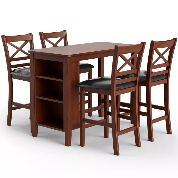 Color: Antique Walnut, Black Material: MDF, Rubber Wood, PU, Foam Table Size: 48'' x 24'' x 36.5'' (L x W x H) Chair Size: 18.5'' x 16.5'' x 39'' (L x W x H) Sitting Height: 25'' Net Weight: 120 lbs Weight Capacity of Tabletop: 220 lbs Weight Capacity of Each Shelf: 11 lbs Weight Capacity of Each Chair: 300 lbs Package Includes: 1 x Bar Table 4 x Solid Wood Bar Chairs